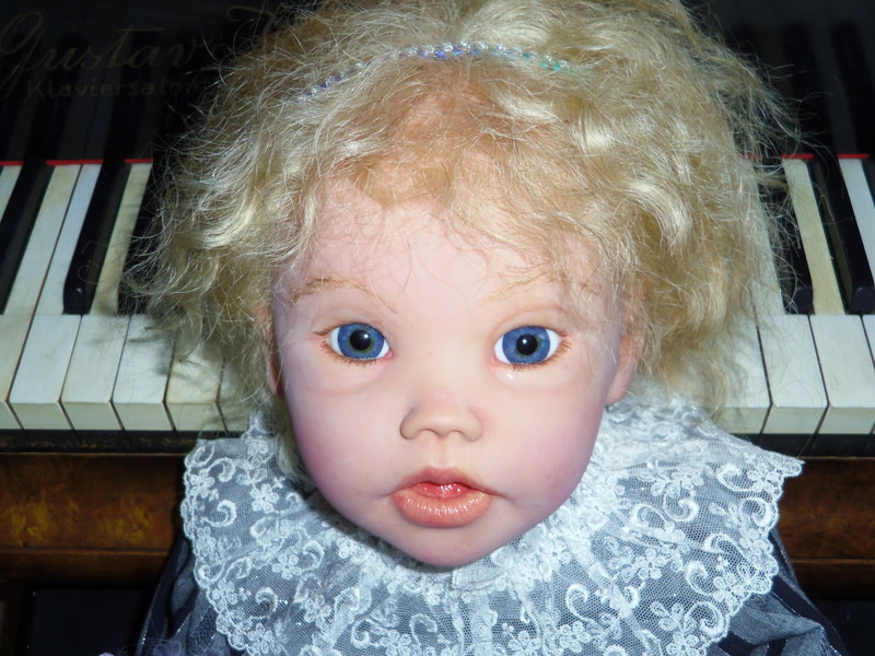 Auch ihre Augenbrauen sind blond und sind gerootet. Die Wimpern sind hell und geklebt. Sie hat blaue Lauscha Designer Figurenaugen.